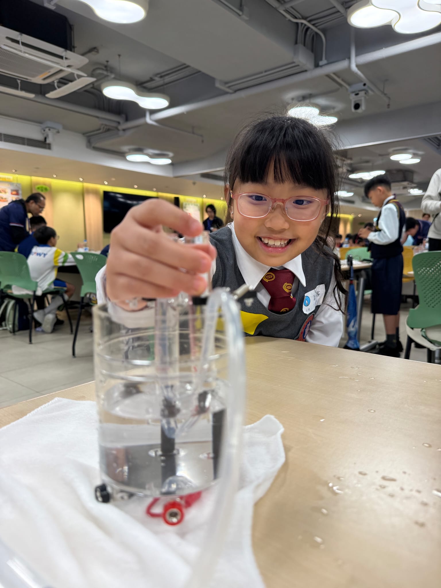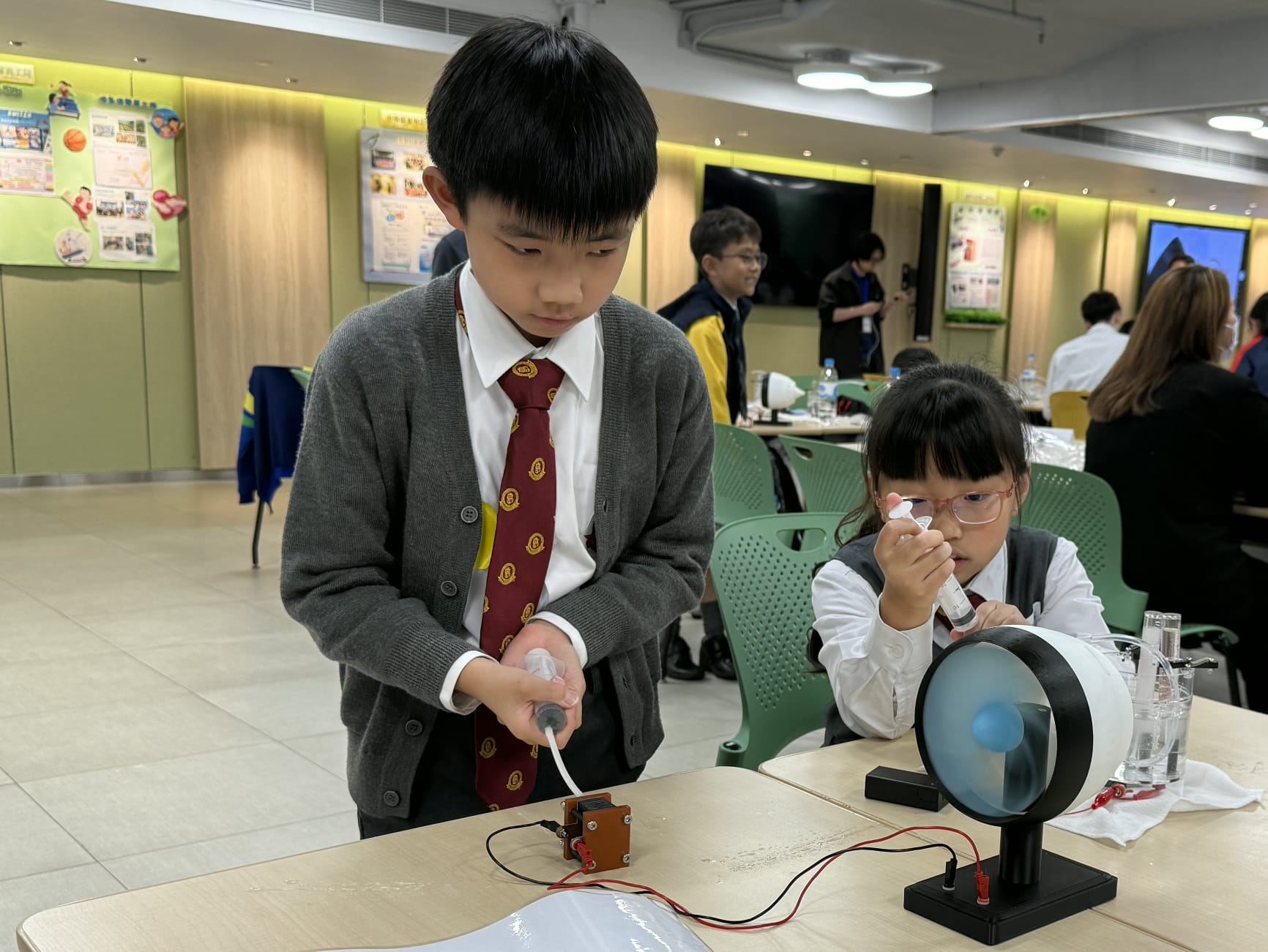 在活動中,同學們不僅學習了能源相關知識,更親手完成科探小實驗:透過水電解過程抽取氫氣,並成功推動小電器運作 。